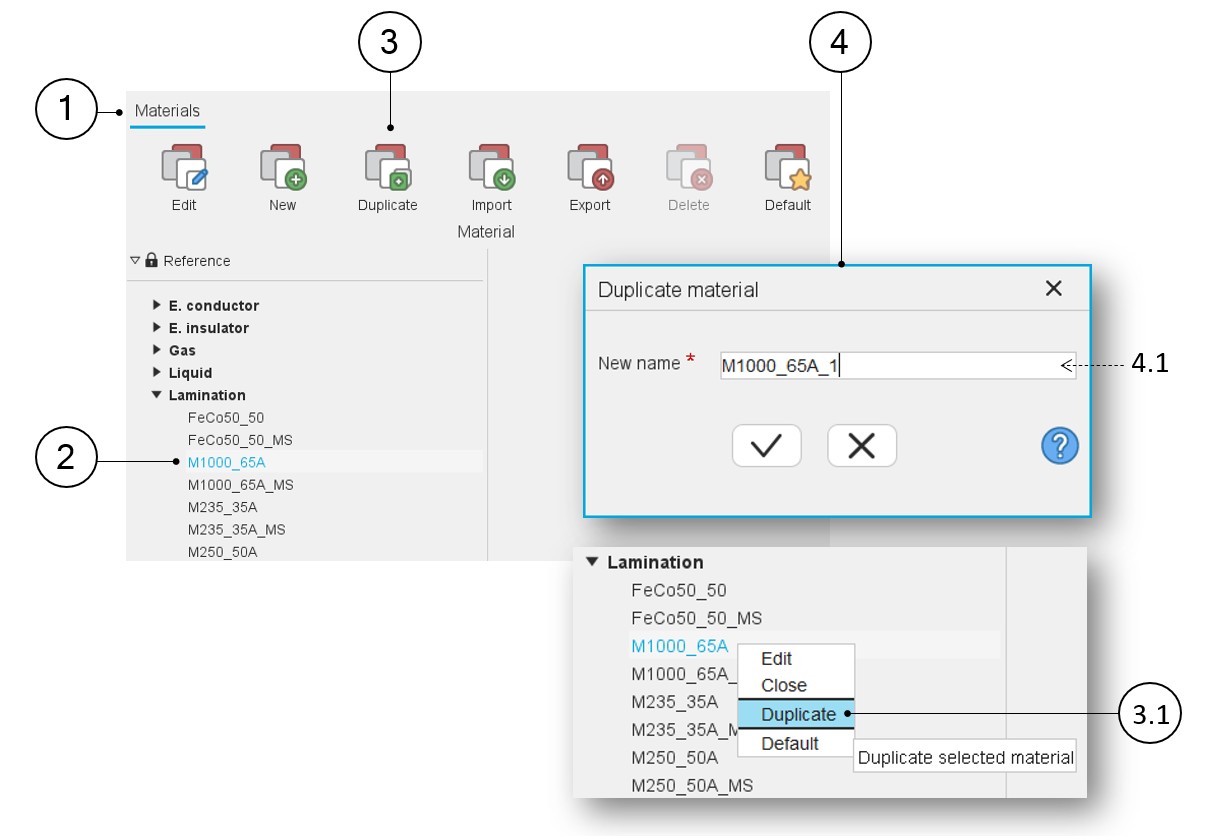 | 3 | The first way to duplicate material consists of clicking on the icon “Duplicate” in the “Materials” menu or by using the right mouse button to expand the corresponding drop-down menu and then clicking on the function Duplicate (3.1). |