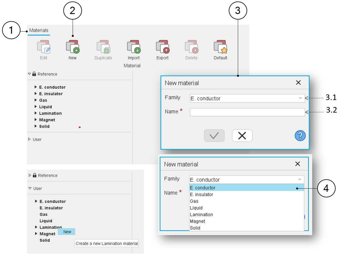 | 3.1 | Select the family to which the new material belongs (Electrical conductor, Electrical insulator, Gas, Liquid, Lamination, Magnet and Solid). |