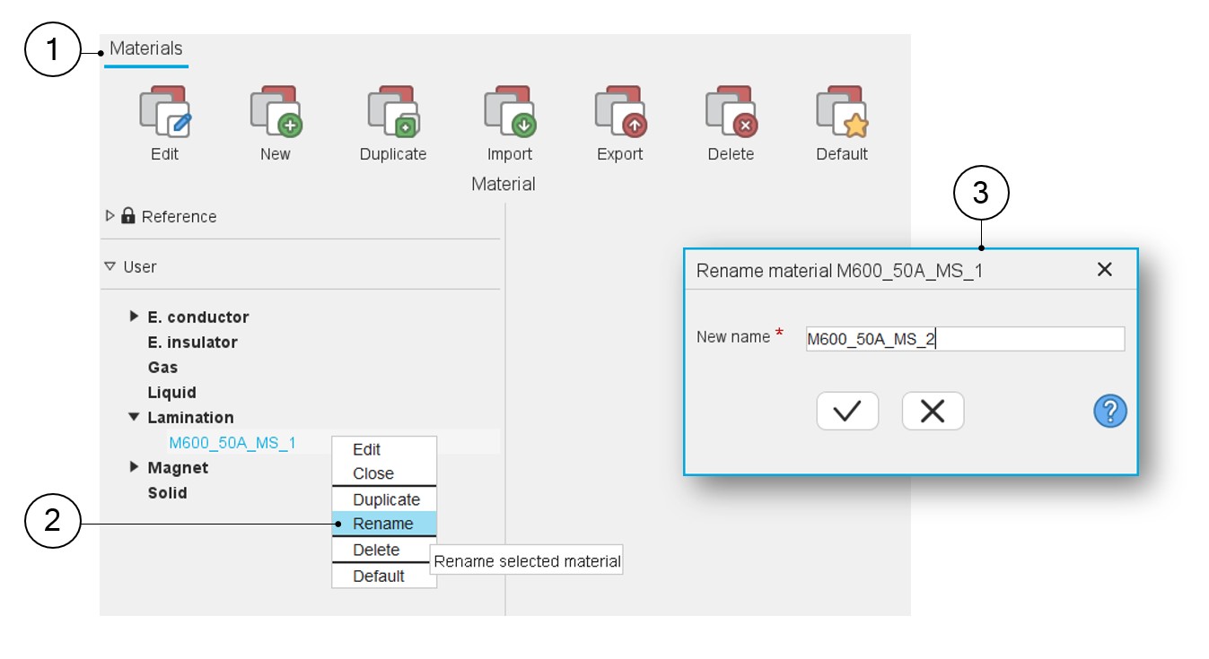 All the materials stored in the “User material database” can be renamed. The name of materials stored in the reference material database cannot be renamed. If needed, they can be duplicated as illustrated in the previous section.