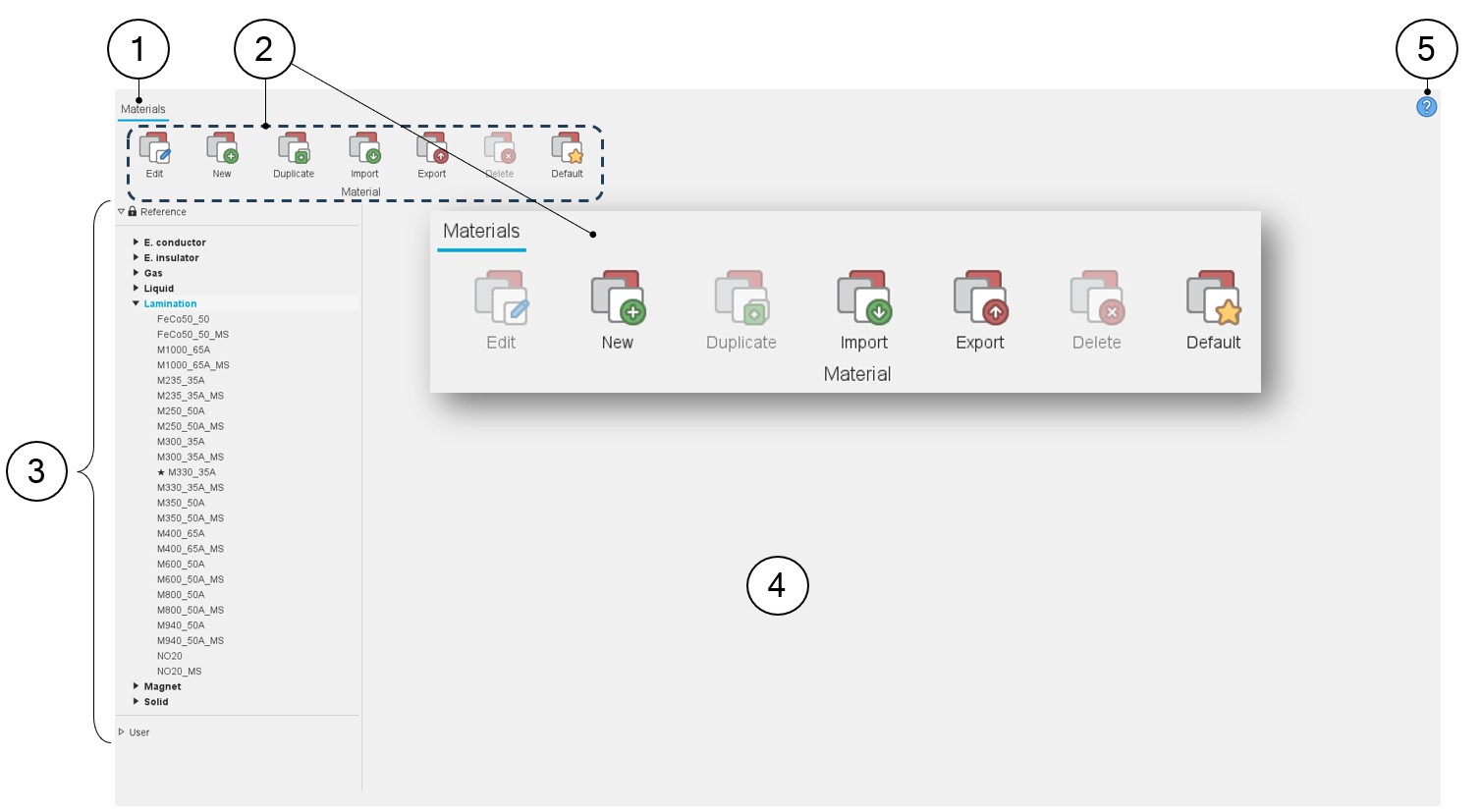| 5 | Access to the online user help guide dedicated to the usage of Materials. |
