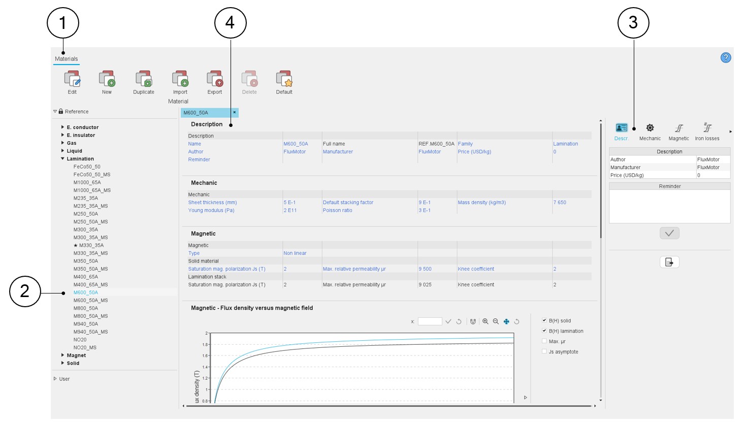 | 3 | Reference materials databases are available. Materials in these databases are read only. However, they can be copied and moved into user’s databases. In each material family there are some materials that are proposed by FluxMotor to cover the basic needs. User’s materials databases... The users can create new databases. See the process in the chapter “Reference commands”. |