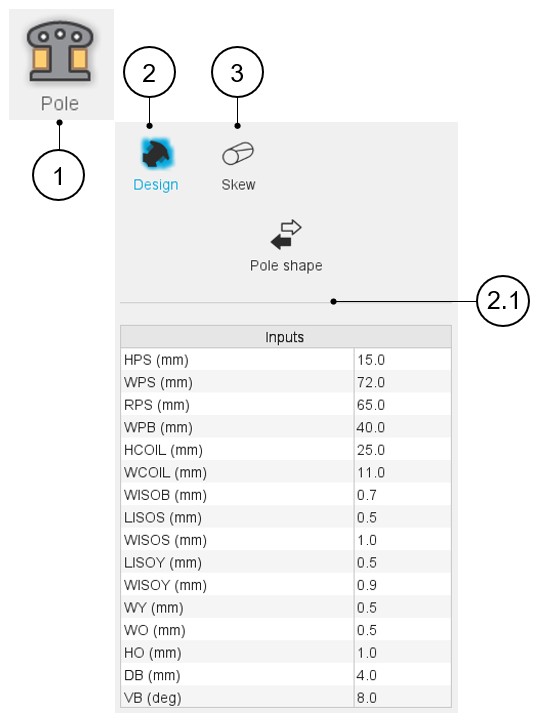 For the inner salient pole (Inner Rotor machine), two sections are available: Design and Skew.