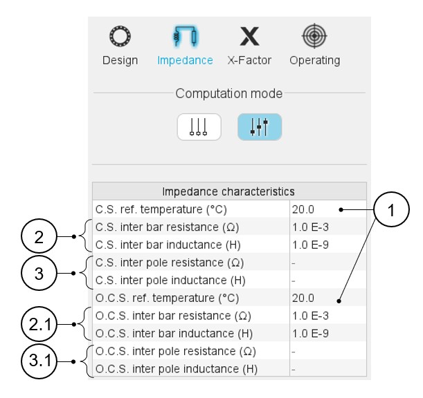 When automatic computation mode is set, inter-bar end-ring impedances are computed by internal processes, being a function of the temperature at the end-ring (at Connection Side and Opposite Connection Side), and the material of the end-ring.