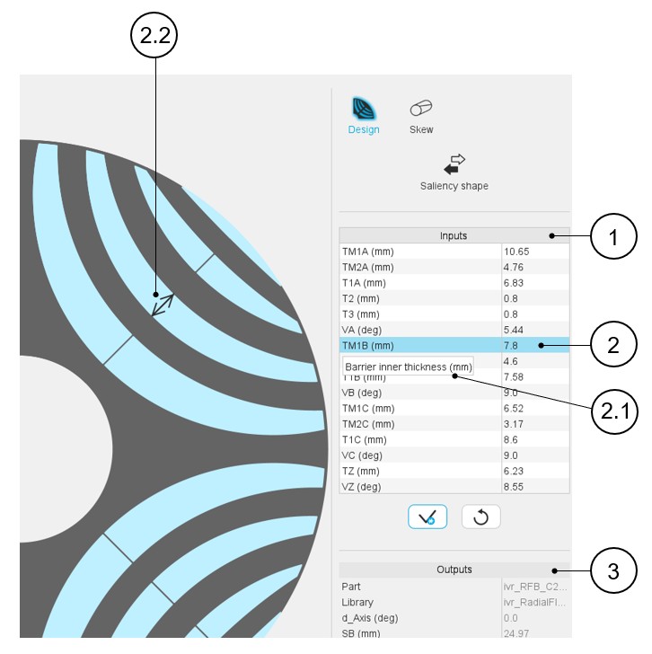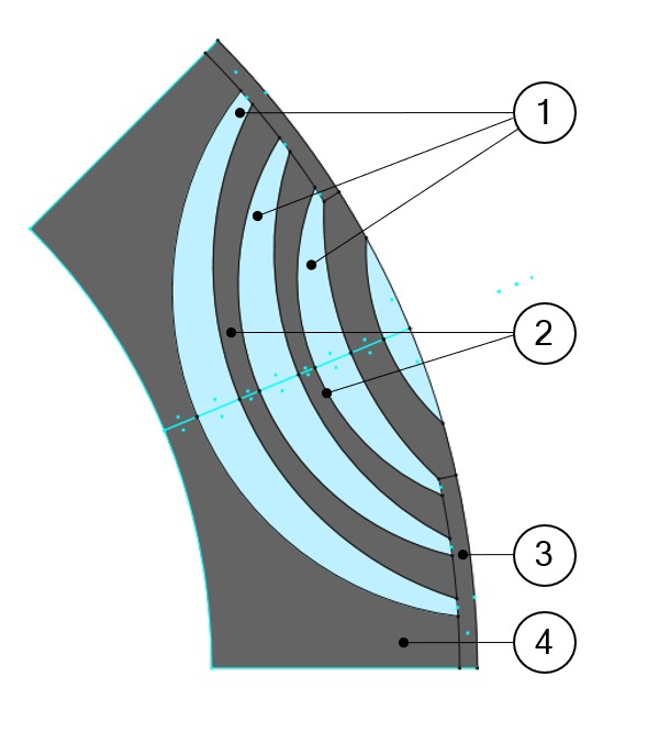 1 Flux barrier 2 Web 3 Bridge 4 Yoke Here is a list of possible elementary regions for an inner saliency:- Yoke, Web, Bridge, Pole core, Pole shoe, Interpole