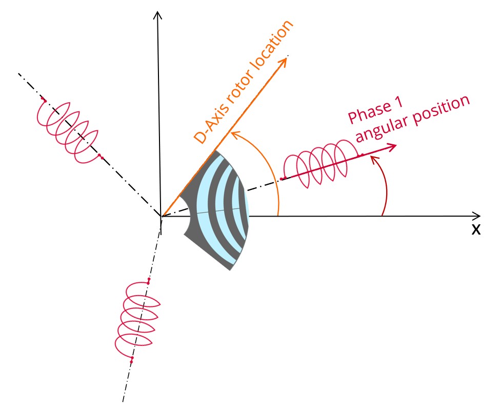 The relative angular position between the axis of the stator phase 1 (reference phase) and the rotor D-axis position must be controlled to perform the tests.