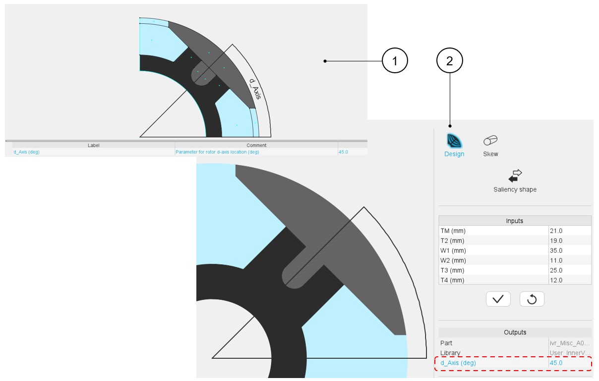 The rotor d-axis location is an output parameter (read only data) of saliency parts. It completes the description of the topology, and it is automatically used to define the relative position between the axis of the stator phase 1 (reference phase) and the rotor D-axis position for performing the tests when needed.