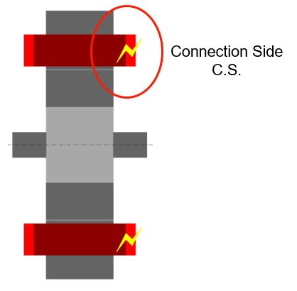| The dimensions are illustrated with arrows. | The connection side (C.S.) is identified by yellow lightning. |