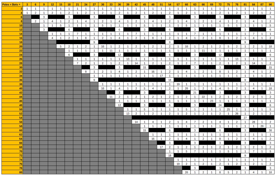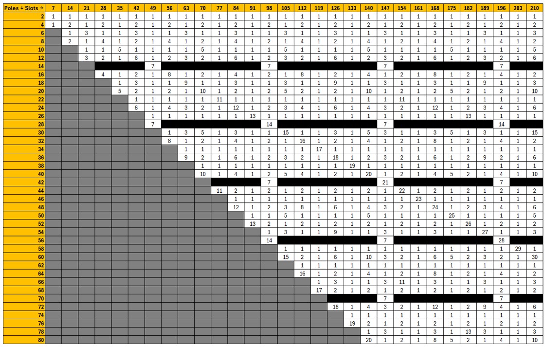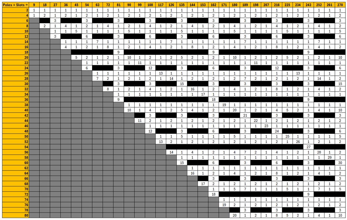 Three tables representing a selection of combinations of number of poles and number of slots for the most typical number of phases (three, five and seven) are presented below.
