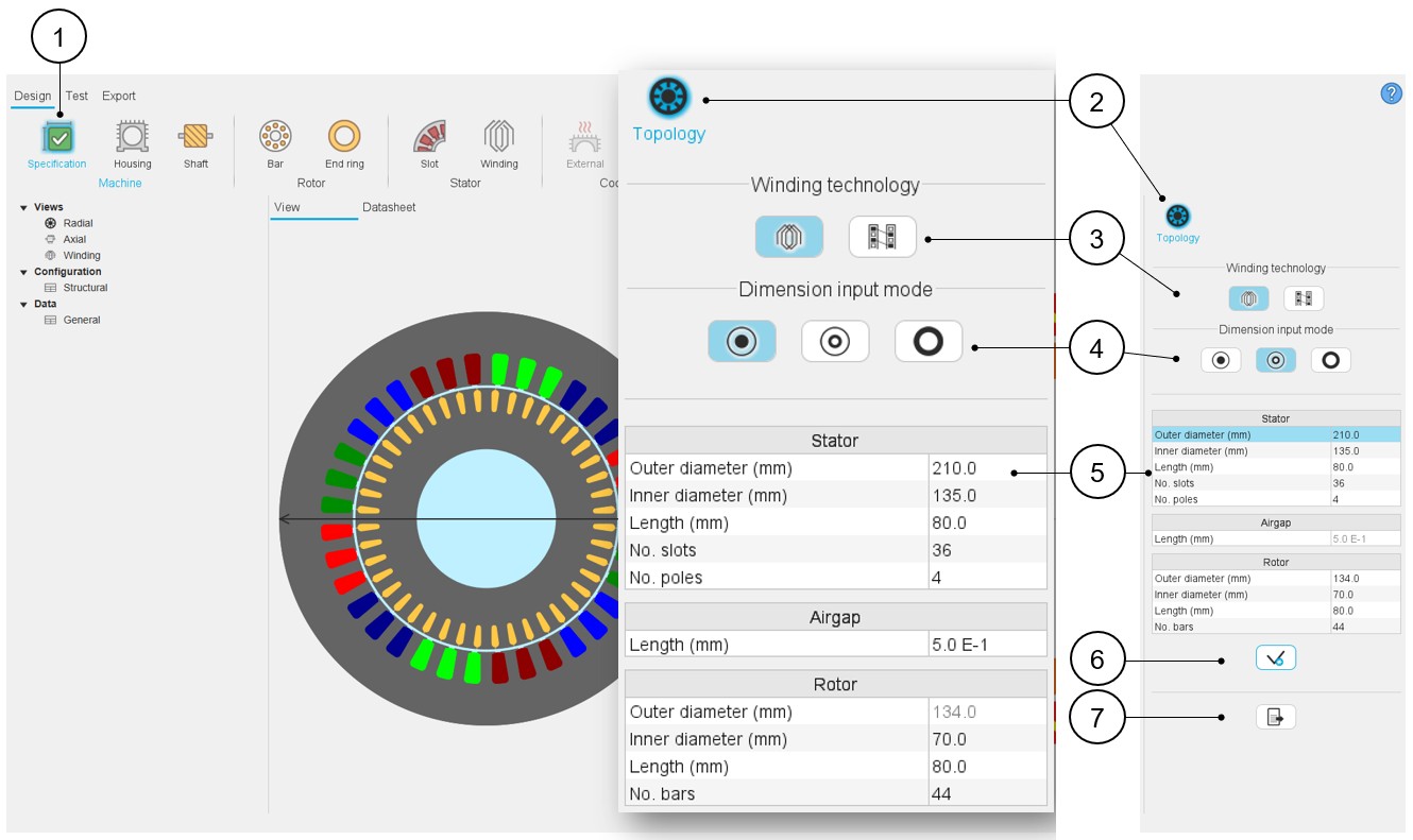 | 2 | Select the topology section for defining the structural data of the machine, meaning the main overall dimensions (stator and rotor outer and inner diameters) and characteristics like the number of slots, poles. |