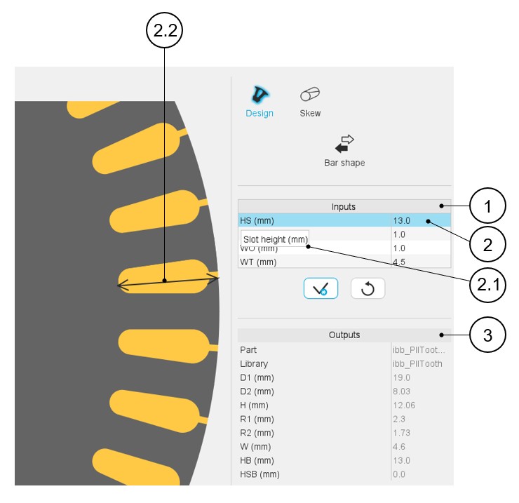 1 Yoke 2 Tooth 3 Tooth foot 4 Solid conductor for describing the squirrel cage Here is the list of possible elementary regions for a bar:- Solid conductor, Tooth, Yoke and Tooth foot illustrated above.