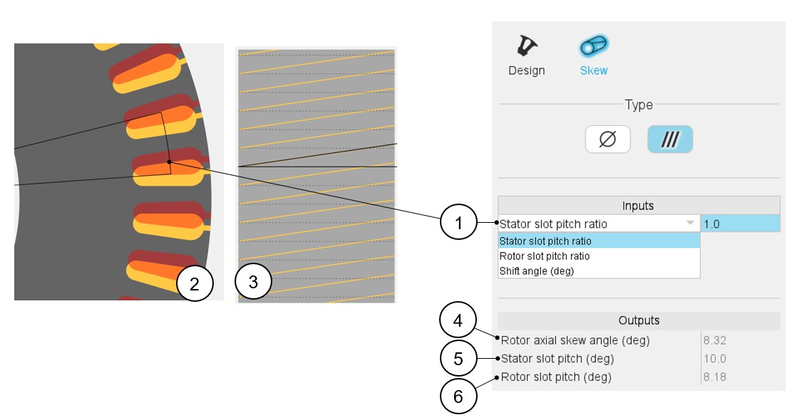 | 3 | Visualization of the equivalent rotor axial skew angle on the machine-developed view |