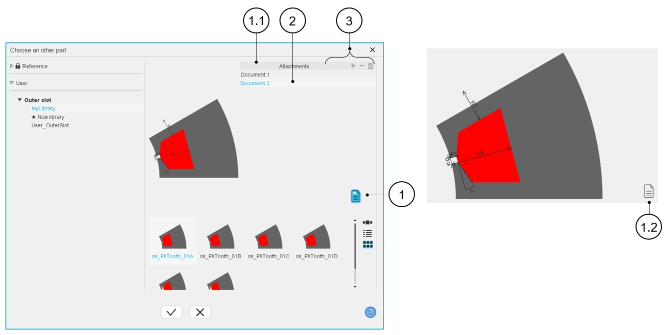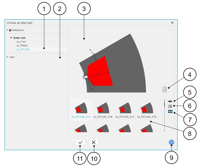 2 Visualization of the user libraries. See the “Part Library” application for additional information. 3 Area where the selected part is displayed (static picture) – Topology + dimension labels. 4 Button to visualize the list of the attached documents. 5 Button to display the thumbnails as a slide show. 6 Button to display the thumbnails as a list. 7 Button to display the thumbnails as a matrix view of pictures. 8 Area to visualize all the topologies of slots from the selected library (ref. 1). 9 Access to the online user help guide dedicated to the usage of the dialog box. 10 Button to close the dialog box and to come back to Motor Factory – Design – Area dedicated to the considered part. 11 Button to choose and to import the selected part and to modify the current machine design. - Attached documentsIn Part Library, it is possible to attach files to the parts (or to the libraries as well). Hence, while choosing a part topology from the Motor Factory Design area via the dialog box described above, we can have access to these attached files if they have been stored previously.