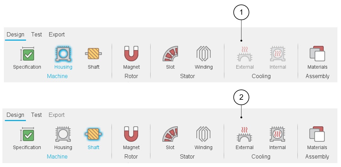 External cooling is unlocked when a circular or a square shape housing is defined (Machine / Housing / Design environment).