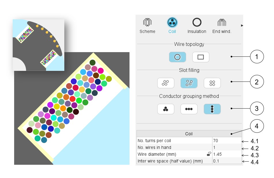 | 3 | Choice of method to group the elementary wires. Three ways allow to fill the slot: Grouped, Horizontal, Vertical. |