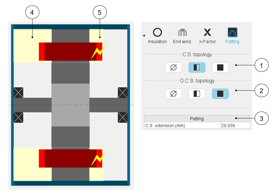| 2 | Button to define a potting with radial and axial contacts (at opposite connection side in this example). |