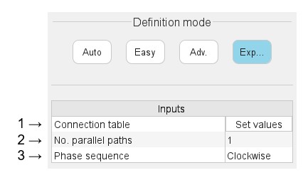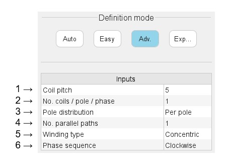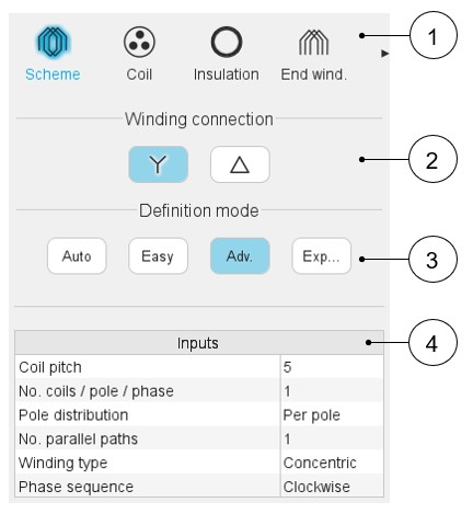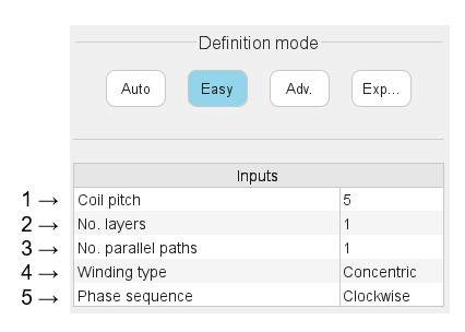 | 3 | Winding definition mode: Automatic, Easy, Advanced, or Expert. See the below section dedicated to the construction of the winding architecture. |