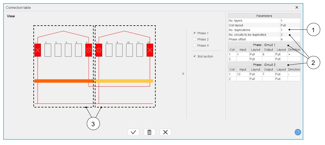 | 3 | Definition of the number of duplications. This number is computed and proposed to the user. It depends on the number of slots and the number of poles. When the winding architecture to build is cut into several identical parts, the corresponding possible number of duplications are proposed (a short list). By selecting the number of duplications, the user must define only 1/n of the connection table. |