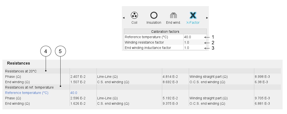 - (R end winding 1) is the initial value of the phase resistance in the straight part of the machine (with X-Factor ≠1)