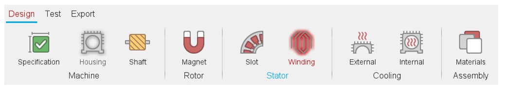 The Motor Factory Design environment button and winding icon in the Stator section are colored in red. This means that there exists a fault in the design, which must be corrected.