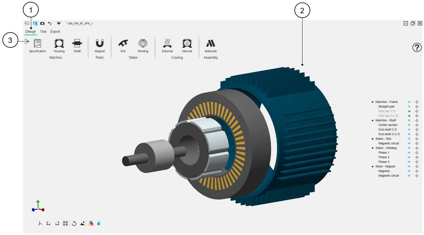 - The DESIGN area to design the motor (topology, winding, materials etc.).