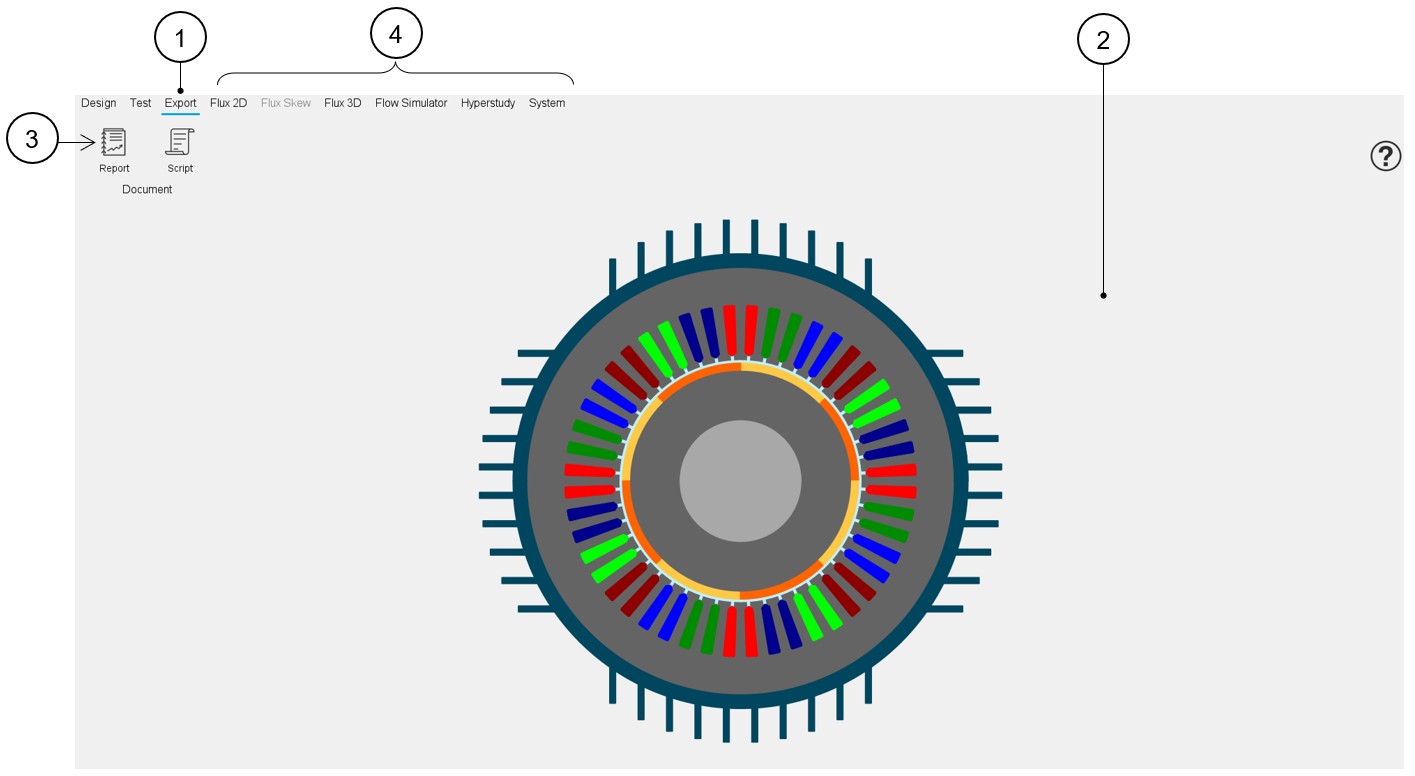 - The EXPORT area to export documents or models to perform advanced studies with other solutions like Flux, Flow Simulator, HyperStudy, SimLab, Amesim, PSIM, Twin Activate, …