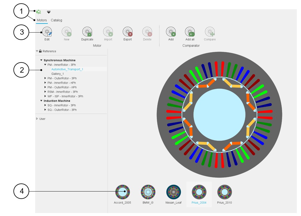 1 Open the supervisor 2 Selection of the targeted machine family – Synchronous, Induction (3), DC (4) 2.1 In the synchronous machine family, one can access the 3-Phase synchronous machine with permanent magnets (inner and outer rotor) – and the n-Phase machine as well. 2.2 In the synchronous machine family, one can access the 3-Phase reluctance synchronous machine (inner rotor). 2.3 In the synchronous machine family, one can access the 3-Phase wound field synchronous machine (inner rotor). 2.4 Once selected, the motor can be opened in Motor Factory either by clicking on the corresponding icon or by clicking on the button “Open in Motor Factory”. 3 Selection of the induction machine family 4 Selection of the DC machine family - Synchronous machines