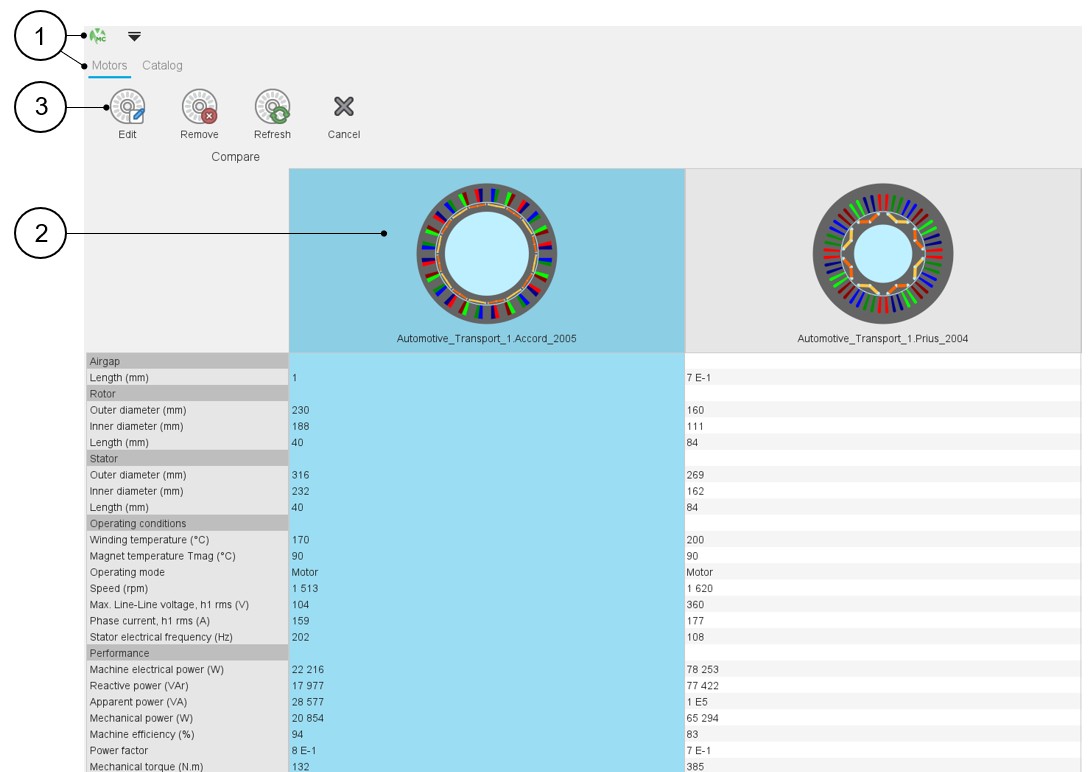 1 Open the application Motor Catalog in the motor environment. Add the motors to be compared and select the motor. 2 Select the machine to be edited in Motor Factory 3 Edit the selected machine in Motor Factory