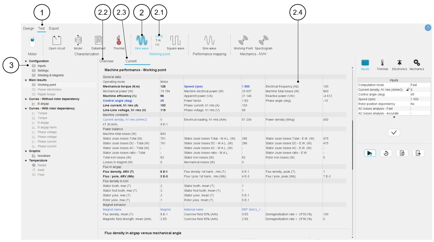 In the Motor Factory Test environment, standard tests are ready to be performed. To select and perform a test, first one must click on a test package belonging to a test family. In the example below, one selects the test package "Sine wave" of the working point test family. Among the list of available tests, one selects the computation of a working point defined by the current (I), the control angle (Ψ) and the speed (N). See the various elements of a test page below.