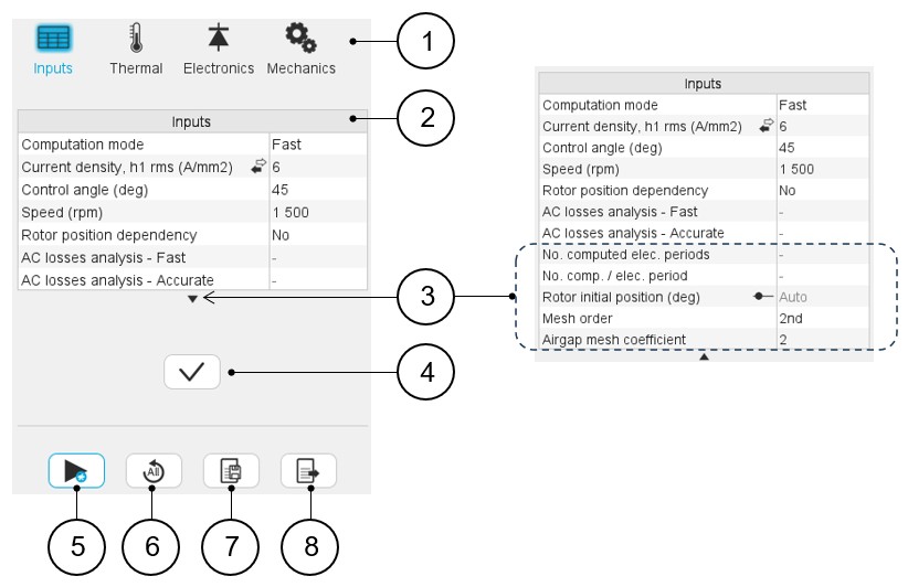 | 4 | Scrolling selection bar where several sections can be selected to define the settings of the test. In this example four sections are available: Inputs, Thermal, Electronics and Mechanics. Once one setting section is selected, the user can define the corresponding inputs. |