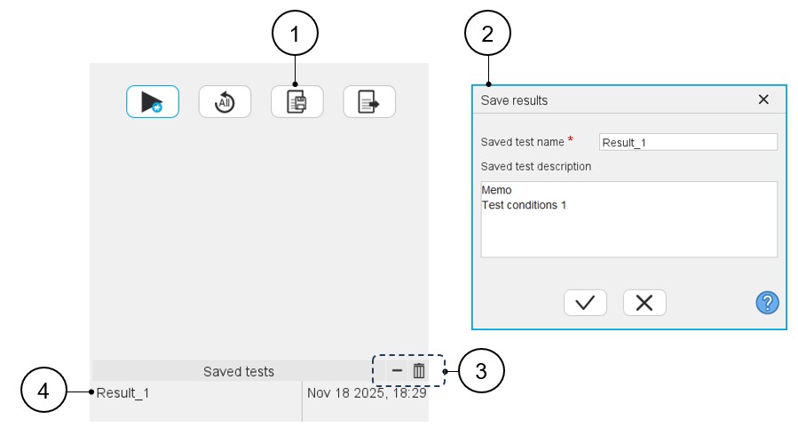 1 Button to save the test result. 2 Dialog box to save test results. Give a name and write a description. 3 By clicking on the Remove selected test (-) button, the selected saved test result is removed.By clicking on the Remove all tests (bin) button all the saved test results are removed. 4 List of the saved tests. The list of saved test results is limited to five elements. The saved results can be displayed in the test area for analysis. See below to know how to do that.