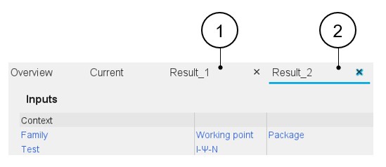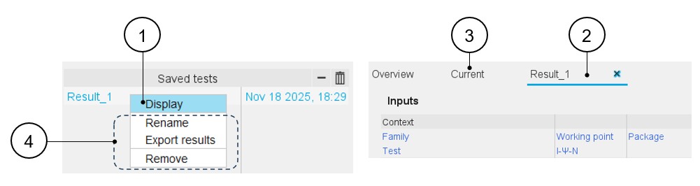 2 The test result is displayed in a new tab inside the test results zone. 3 Displaying edited results (saved and current results) is possible by clicking on the corresponding tabs. Several saved tests can be displayed. 4 Note: Other functions available in this list box are:The selected test result can be renamed (Rename), exported (Export results - see next section) and removed (Remove).