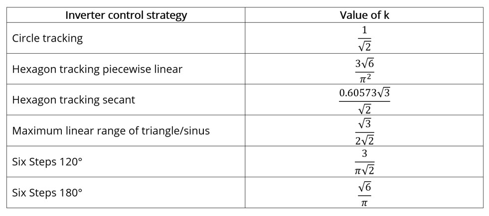 The considered inverter control strategies and their corresponding values of k are listed in the table below.