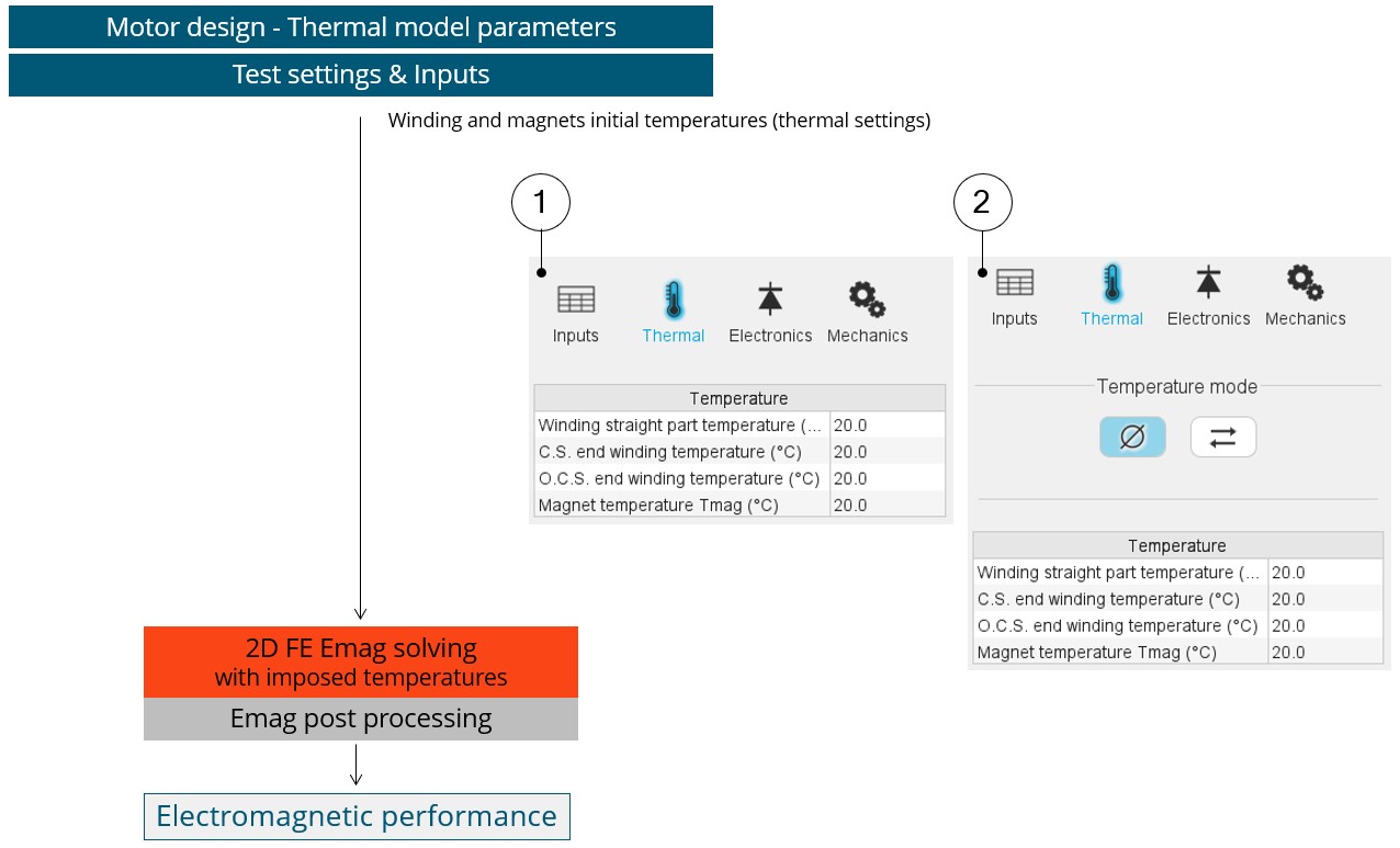1 Electromagnetic solving (Finite Element computation) for a list of magnet temperatures between the min. and max. values given in the setting. 2 Loss terms are interpolation regarding to the magnet temperature given by the thermal computation in the next step. 3 Based on the speed and losses computed in the electromagnetic working point for the first magnet temperature, the thermal characterization is performed to define the temperature distribution inside the machine. The materials physical properties corresponding to the machine active components are then updated.