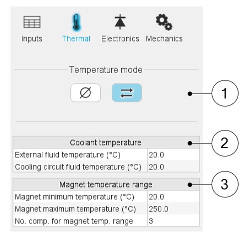 1 Dialog box to define thermal settings. Iterative solving mode is selecting. 2 With the second solving mode (i.e. with the iterative thermal solving mode) the coolant temperatures must be defined. Definition of coolant temperatures (if there is a cooling circuit) to be considered: - External fluid temperature (1)