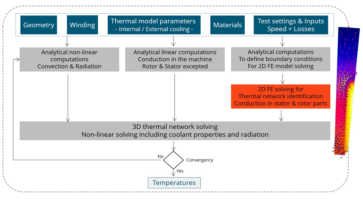 4 Iterative process = loop between the interpolation of losses and the thermal computations until the convergence on the temperature is reached (See below where the convergency criteria can be adjusted, if needed). 5 A last electromagnetic solving (Finite Element computation) with final set of temperatures is performed once the convergence on the temperature is reached (1). Electromagnetic performance and chart of temperatures are computed and displayed.