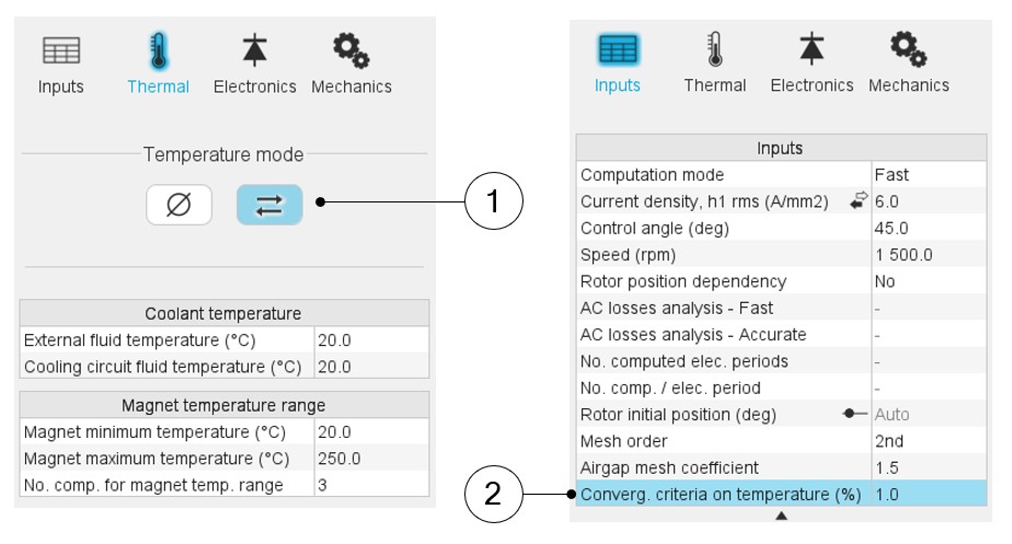 1 Selection of the thermal solving Iterative process in thermal settings 2 Convergence criteria can be adjusted for reaching steady state behavior. The iterative solving is stopped once the temperature variation in the machine between two iterations is lower than the convergence criteria. A percentage close to zero gives more accurate results but takes a higher computation time. A high percentage can make the convergence shorter but decreases the accuracy of the results.