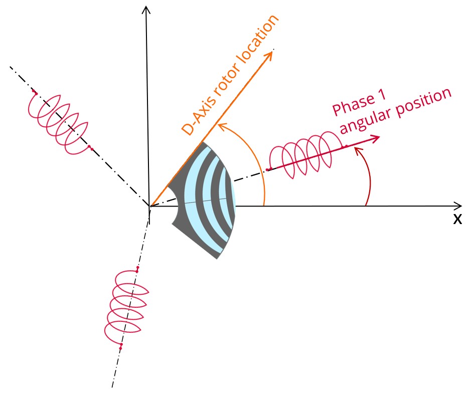 The relative angular position between the axis of the stator phase 1 (reference phase) and the rotor D-axis position must be controlled to perform the tests.