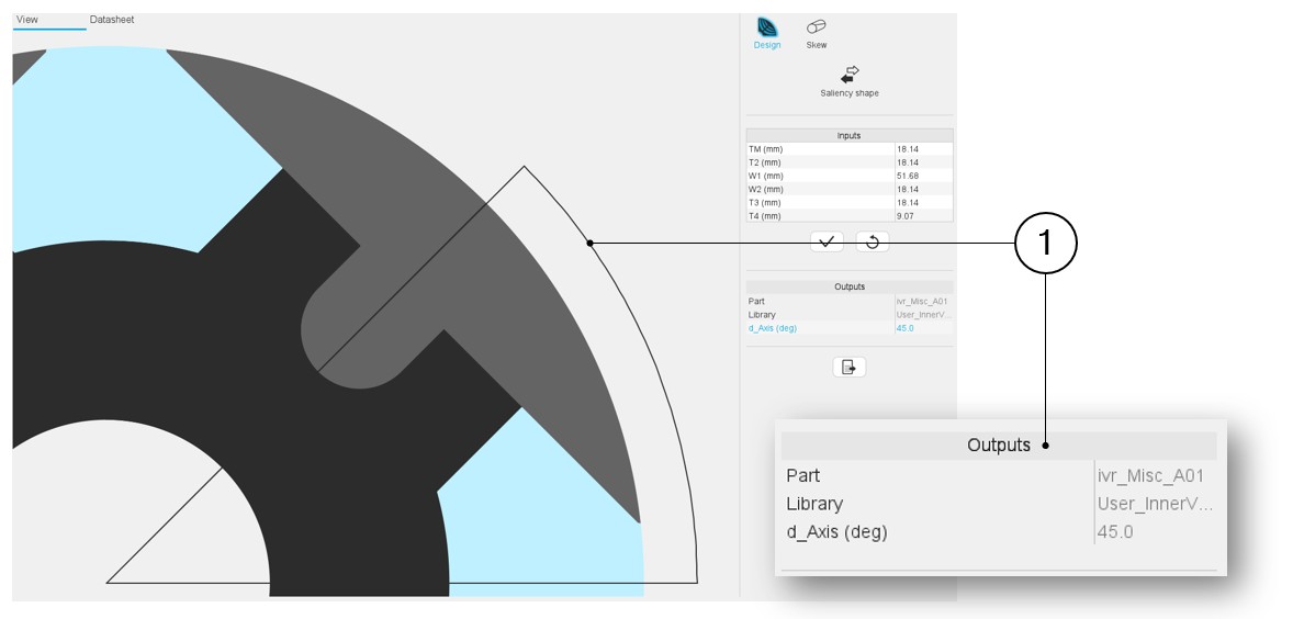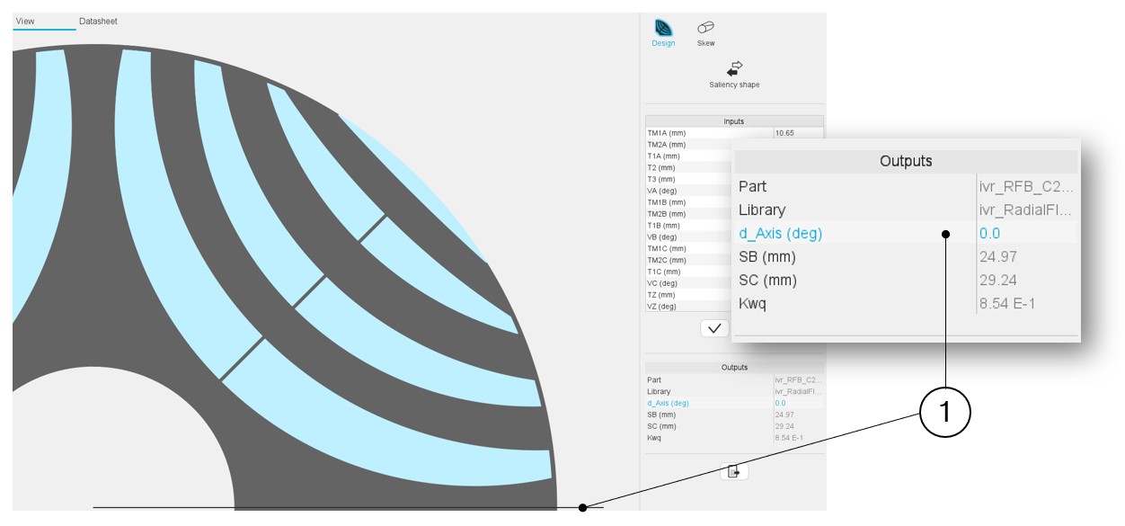 The rotor d-axis location is an output parameter (read only data) of saliency parts. It completes the description of the topology, and it is automatically used to define the relative position between the axis of the stator phase 1 (reference phase) and the rotor D-axis position for performing the tests when needed.