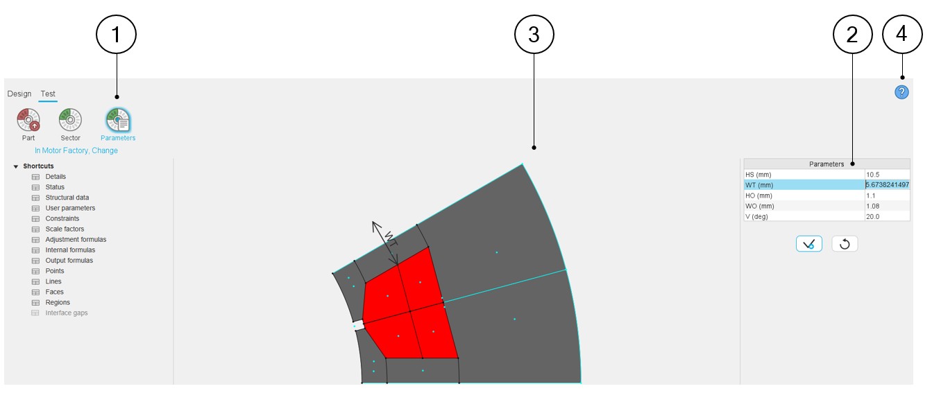 of the parameters in Motor Factory. It allows testing the robustness of the part when all its user input parameters are changed. The user input parameter corresponds to the input parameter of the considered part to test. |