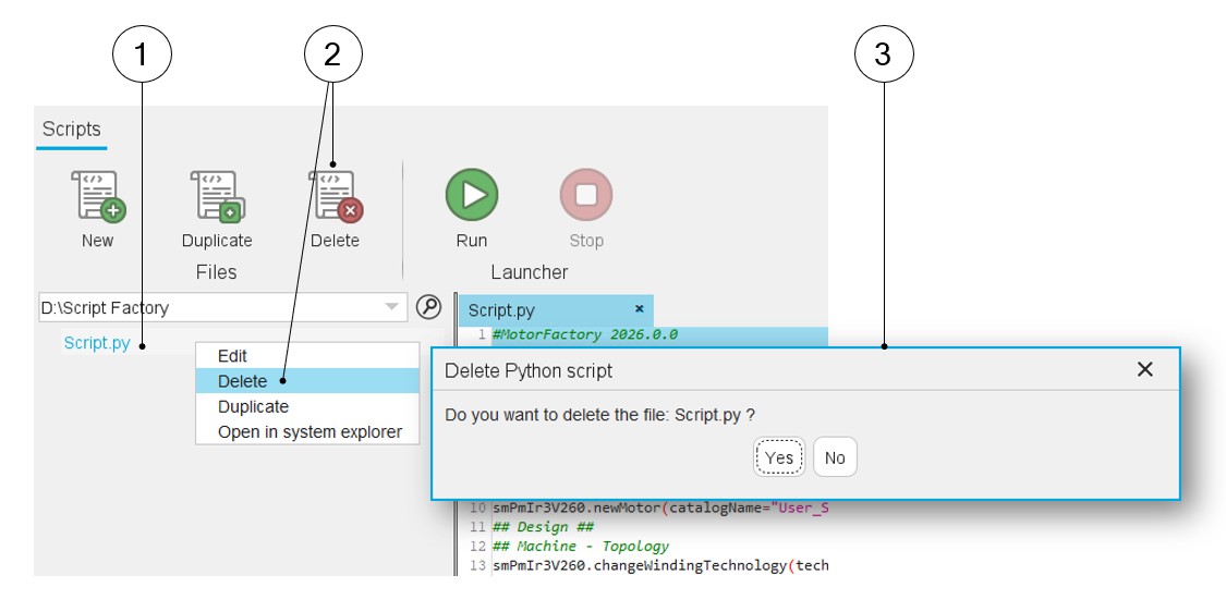 In Script Factory application, a selected python file from the workspace tree can be deleted.