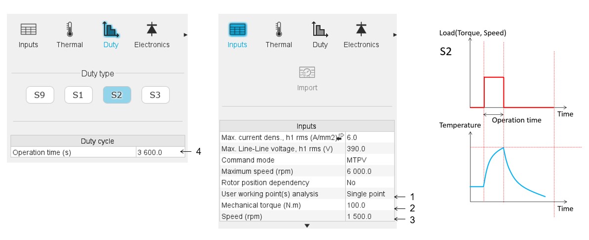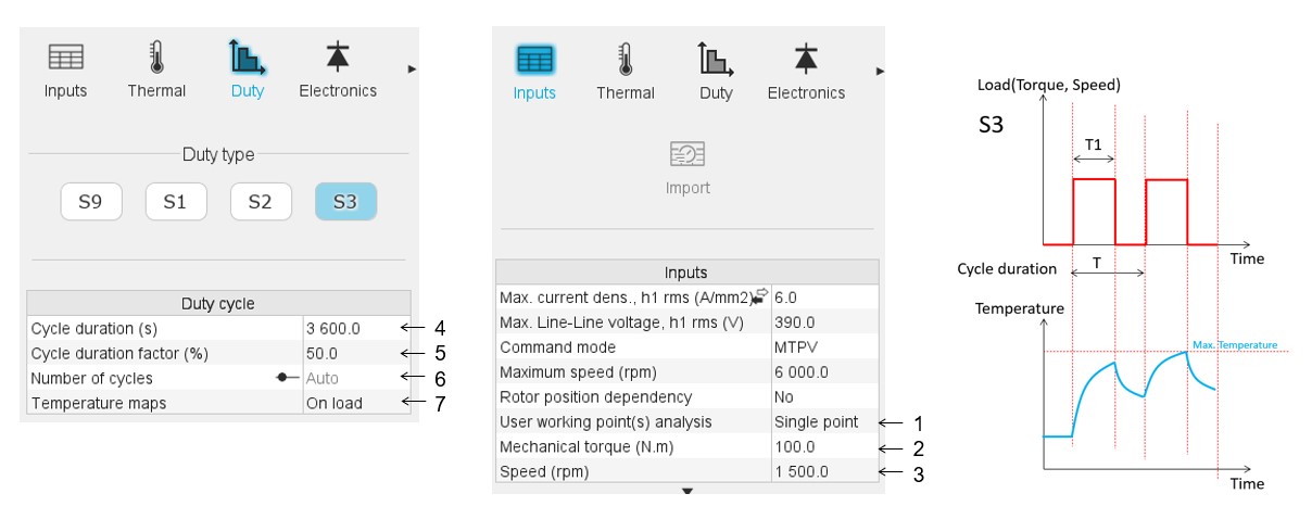 - For S1 and S3, automatic cycle duration estimation is available based on the thermal time constant of the machine (typically 5× time constant), ensuring sufficient time to reach steady-state or periodic stability.