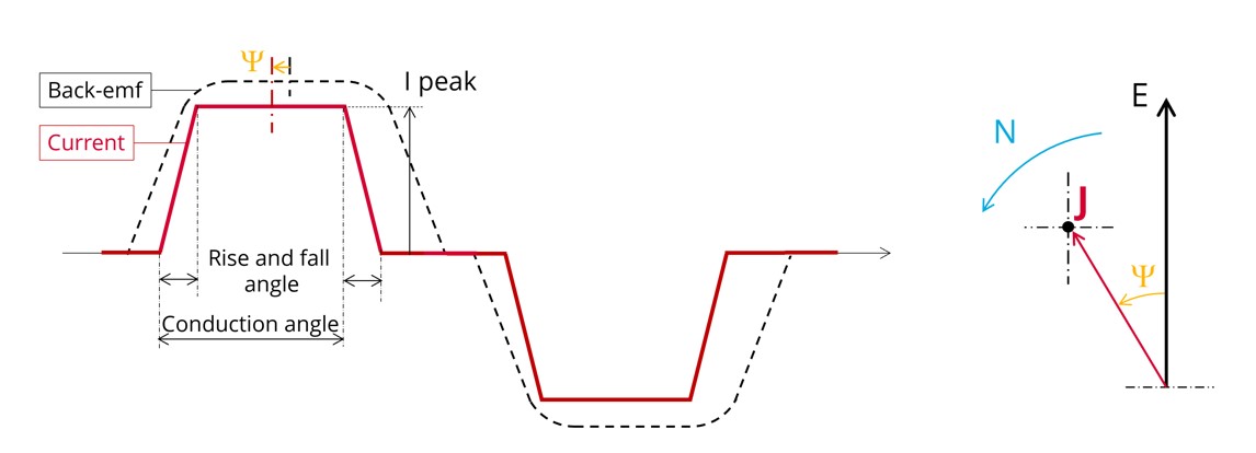 The control angle between the back-emf and the phase current, the value of current and the imposed speed induce the resulting working point. Then, the main corresponding performance are computed and displayed.