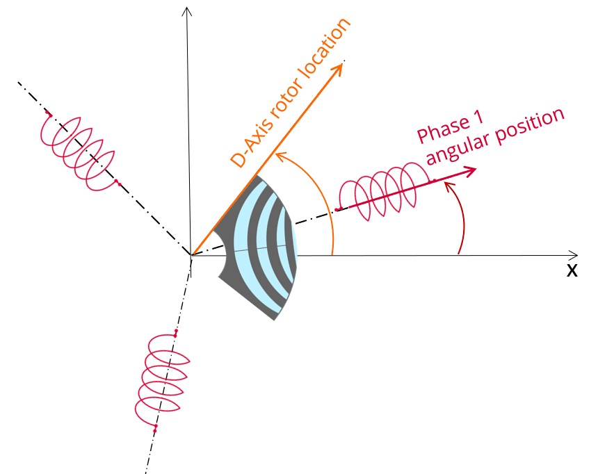 The relative angular position between the axis of the stator phase 1 (reference phase) and the rotor D-axis position must be controlled to perform the tests. See the picture below which will allow defining the working point of the machine.