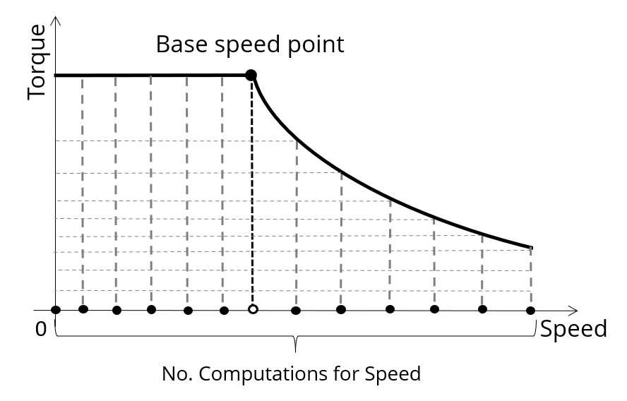 For the speed range [Nbase; Nmax.], the number of computations for torque is imposed by the number of computations for speed in the speed range [Nbase; Nmax.] (Red points in the image shown below).