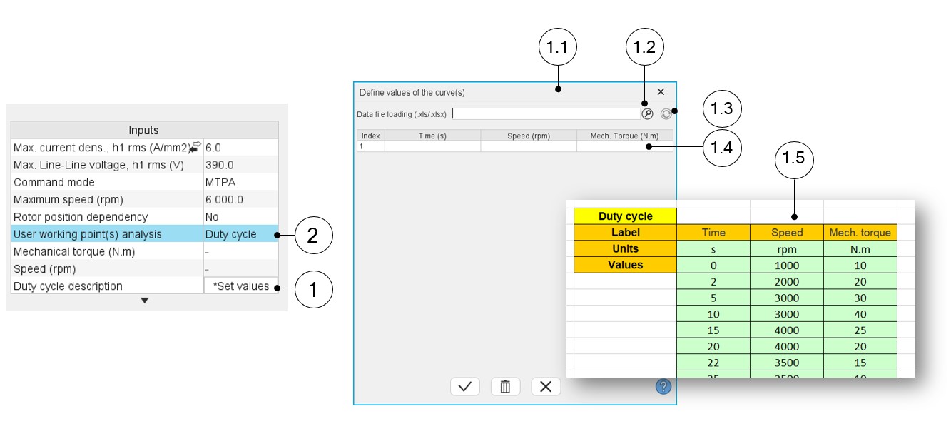 1.1 Dialog box opened after having clicked on the button “Set values” in the field “Cycle description” 1.2 Browse the folder to select an Excel file which describes the duty cycle. 1.3 Button to refresh the table data when the considered Excel file has been modified. 1.4 Fields to be filled with data to describe the duty cycle to be considered. 1.5 Excel file template to define the duty cycle