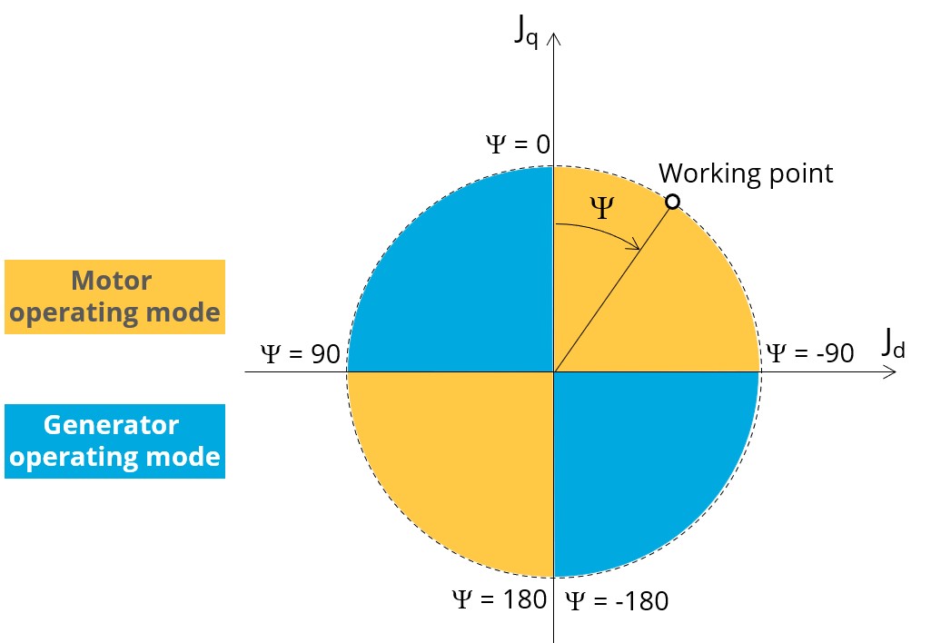 Considering the vector diagram shown below, the “Control angle” is the angle between the electromotive force E and the electrical current (J) (Ψ = (E, J)). It is an electrical angle. It must be set in a range of -90 to 90 degrees.