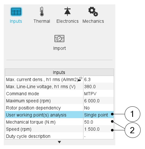 1 Select the “Single point” option to perform a computation on one working point. 2 Define the targeted working point mechanical torque and speed. - User working point(s) analysis = Duty cycle