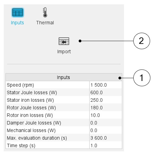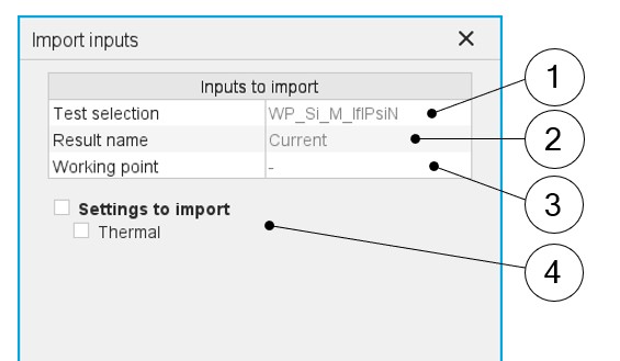 | 2 | Click on the button “import” to import inputs corresponding to a solved test. All existing data of the selected test will be imported into the inputs of the thermal characterization. The data which does not exist in the outputs of the selected test are set to 0. |