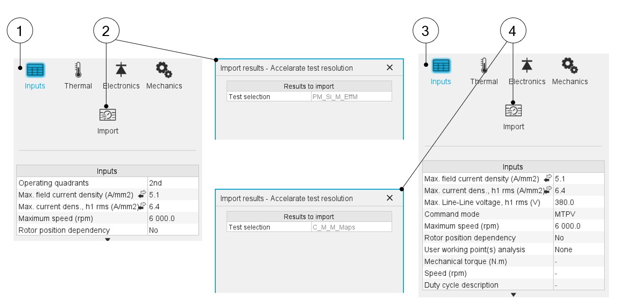An import button is available for allowing sharing the data simulated in Flux between “Characterization / Model / Map” and “Performance mapping / Efficiency map” tests.