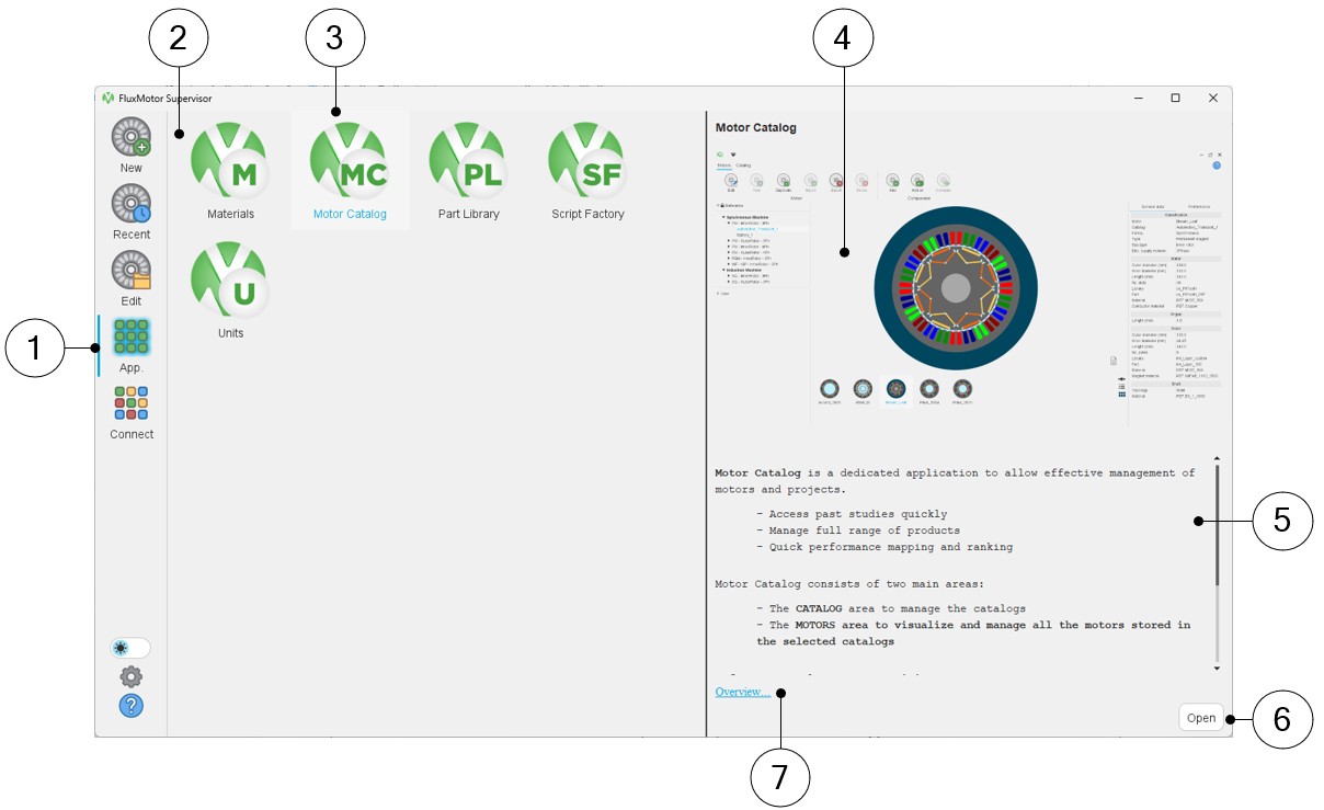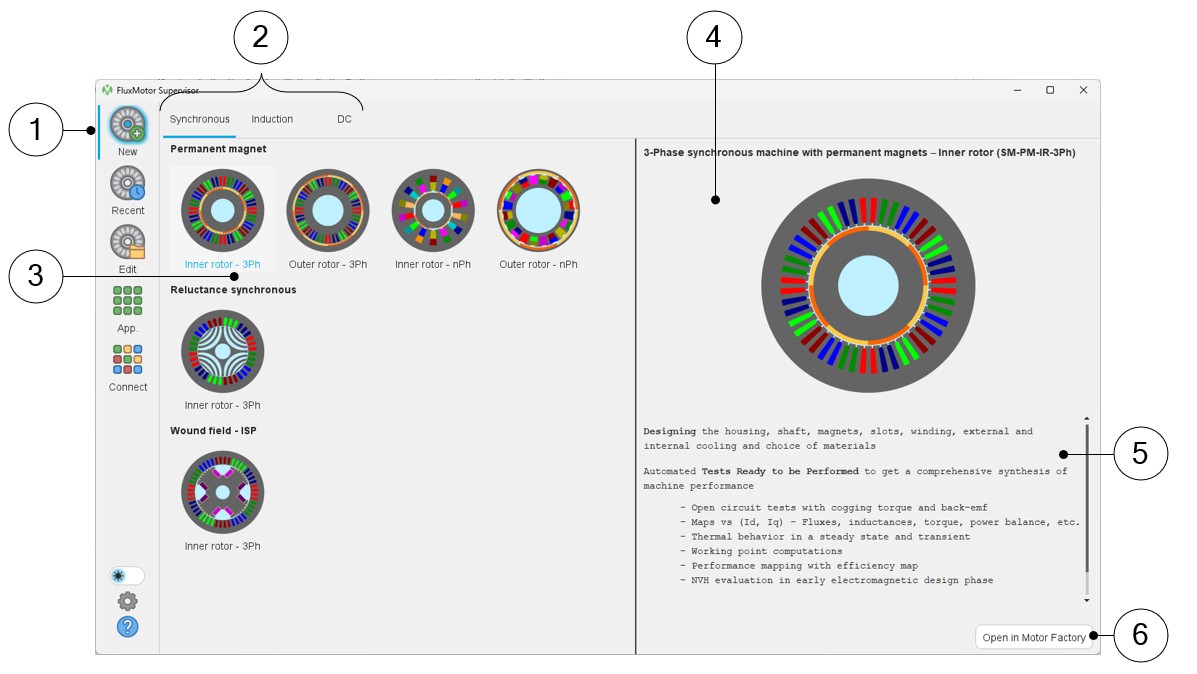 | 1 | Main entry points of the supervisor – New motor in Motor Factory, edit a Recent motor, Edit a motor from catalogs, Open FluxMotor satellite Applications, and Open Altair® solutions. |